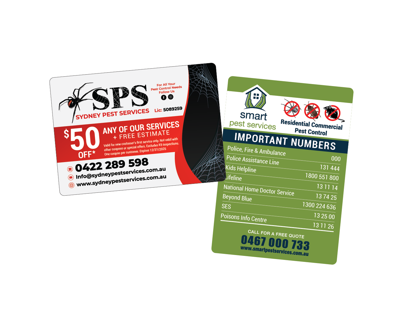 Fridge magnets for pest controllers work because they’re simple and practical. They live in the most used room in the home—the kitchen—and they’re always in view. No lost business cards. No forgotten flyers. Just constant exposure that keeps your brand top-of-mind.